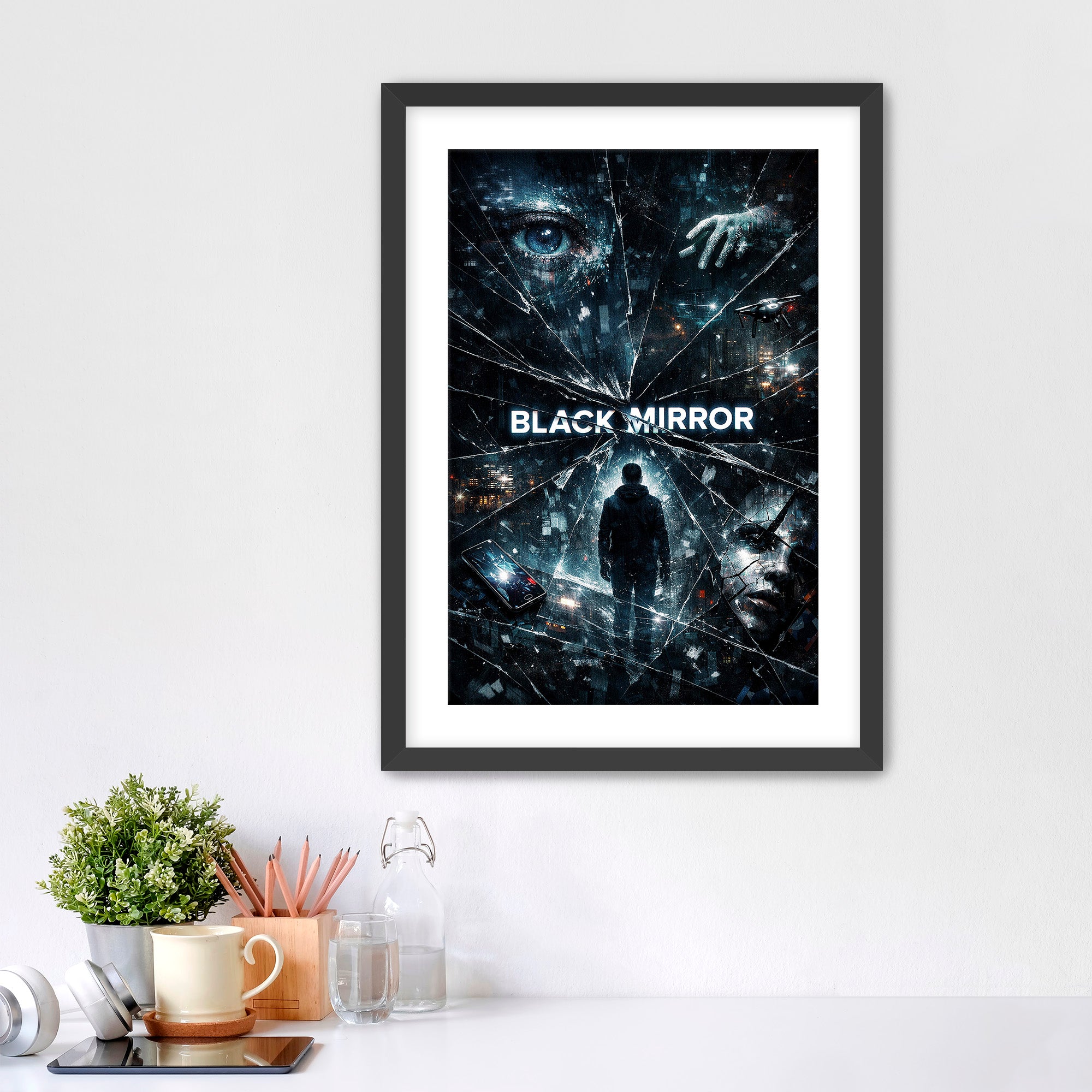 Blending cyberpunk aesthetics with cinematic lighting and layered textures, the piece creates a dramatic futuristic atmosphere that reflects the series’ themes of identity, surveillance, and the consequences of a hyper-connected world. Perfect for fans of Black Mirror and dystopian sci-fi, this artwork adds a bold, mysterious presence to home theaters, game rooms, offices, or modern spaces inspired by technology and futuristic storytelling.