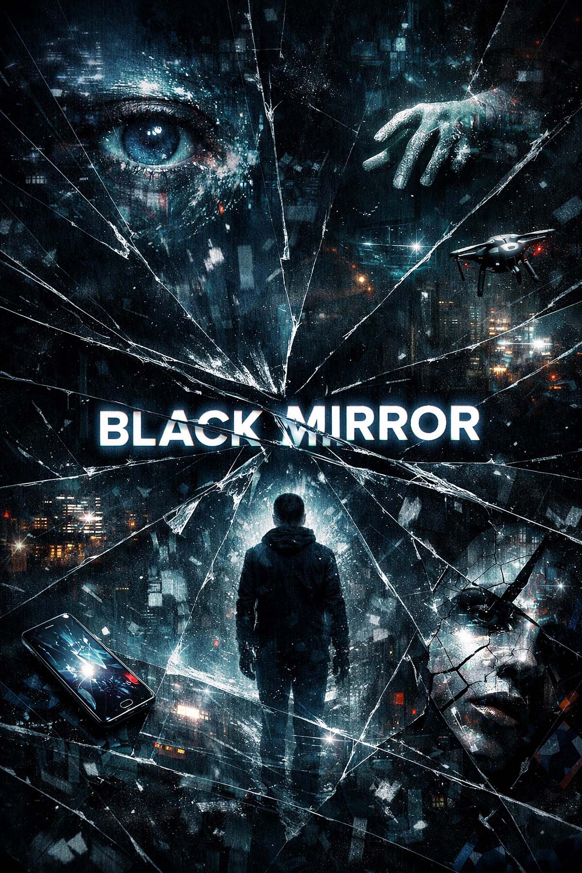 This Black Mirror–inspired artwork captures the dark, thought-provoking atmosphere of the dystopian sci-fi series. A lone figure stands in a fractured digital cityscape surrounded by shattered glass reflections, glowing technology, surveillance drones, and distorted faces, symbolizing the unsettling relationship between humanity and modern technology.