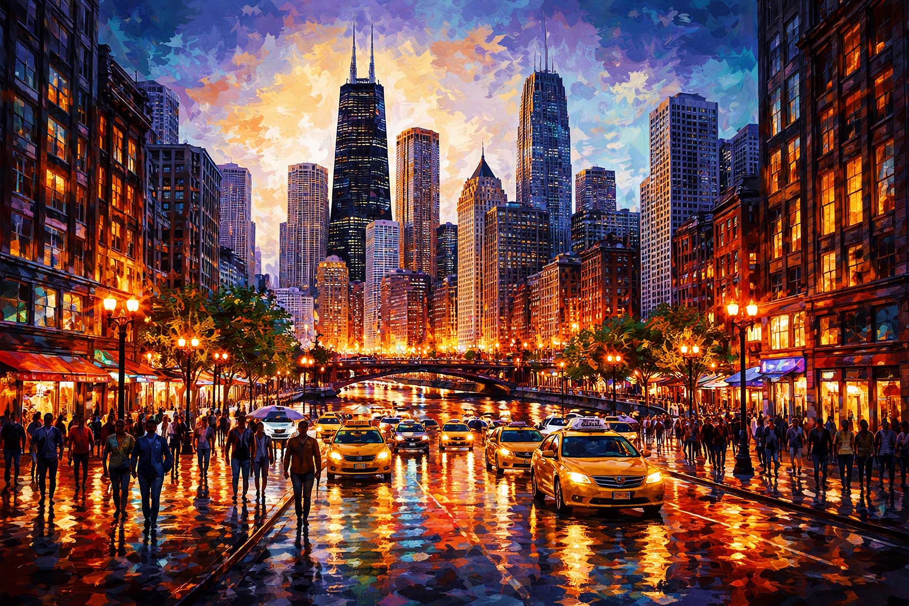 A vibrant cityscape artwork capturing the energy of Chicago, Illinois at sunset, where glowing streetlights reflect across rain-soaked streets along the iconic river. The skyline rises dramatically in the background, featuring recognizable skyscrapers and modern architecture that define the city’s legendary silhouette. Yellow taxis, busy sidewalks, and lively storefronts create a dynamic sense of motion and urban life. Warm golden tones blend with deep blues and purples, giving the scene a rich, impressionistic style that highlights Chicago’s nightlife and architectural beauty. Perfect for lovers of city skylines, urban culture, and iconic American destinations, celebrating the atmosphere and excitement of downtown Chicago.