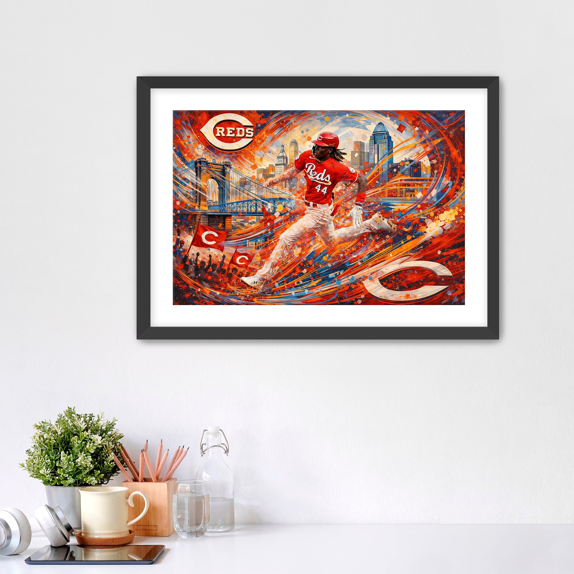A dynamic sports artwork featuring Elly De La Cruz of the Cincinnati Reds sprinting across a vibrant cityscape filled with energy and motion. The Cincinnati skyline, bridges over the Ohio River, and iconic Reds branding frame the scene as swirling red and blue brushstrokes capture the speed and excitement of the electrifying MLB star. Wearing the Reds’ signature red uniform with number 44, De La Cruz appears mid-stride, symbolizing power, athleticism, and the rising future of Cincinnati baseball. The explosive colors and urban backdrop celebrate the passion of Reds fans and the thrilling style of one of baseball’s most exciting young players.