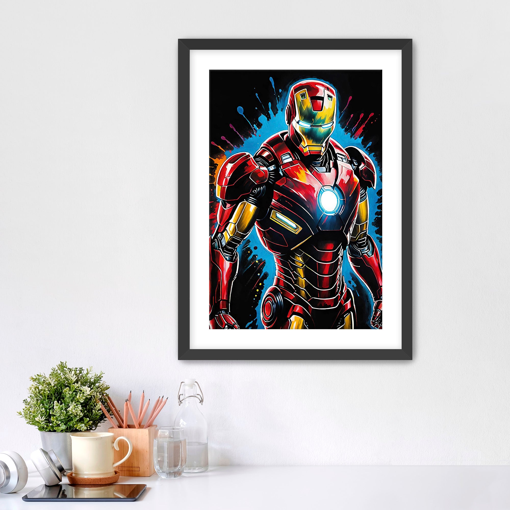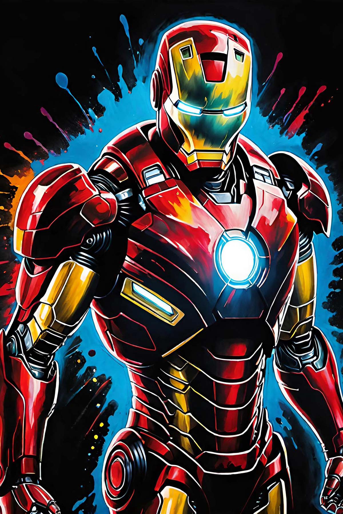 Step into the high-tech world of Marvel with this striking artwork featuring Iron Man, the legendary armored hero created by Tony Stark. The powerful suit of red and gold armor shines with energy as the glowing arc reactor pulses at the center of his chest, symbolizing the technology that powers the Armored Avenger. Bold colors, dynamic paint splashes, and dramatic lighting capture the intensity and innovation behind Stark’s iconic creation. Inspired by the Marvel universe and the heroic legacy of the Avengers, this vibrant scene celebrates the fusion of genius engineering and superhero power that makes Iron Man one of the most recognizable figures in modern comic history.
