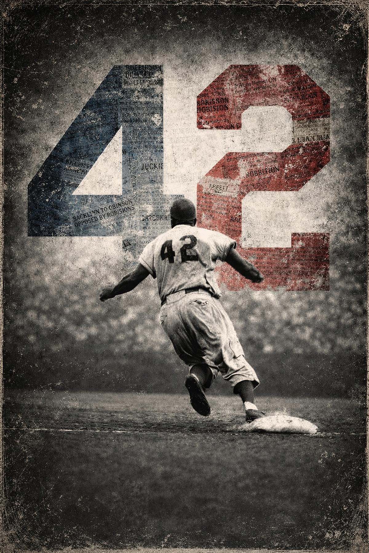 This powerful artwork honors Jackie Robinson, the legendary baseball pioneer who broke Major League Baseball’s color barrier while wearing the iconic number 42. The dramatic composition captures Robinson rounding the bases as the number 42 rises behind him in bold red, white, and blue, symbolizing both American history and his lasting legacy. Vintage textures and historic newspaper-style elements evoke the era when Robinson’s courage and determination forever changed the game. Blending baseball heritage with striking artistic detail, this tribute celebrates the athlete who reshaped the sport and inspired generations. A timeless piece honoring Robinson’s impact on baseball, civil rights, and the enduring meaning of number 42.