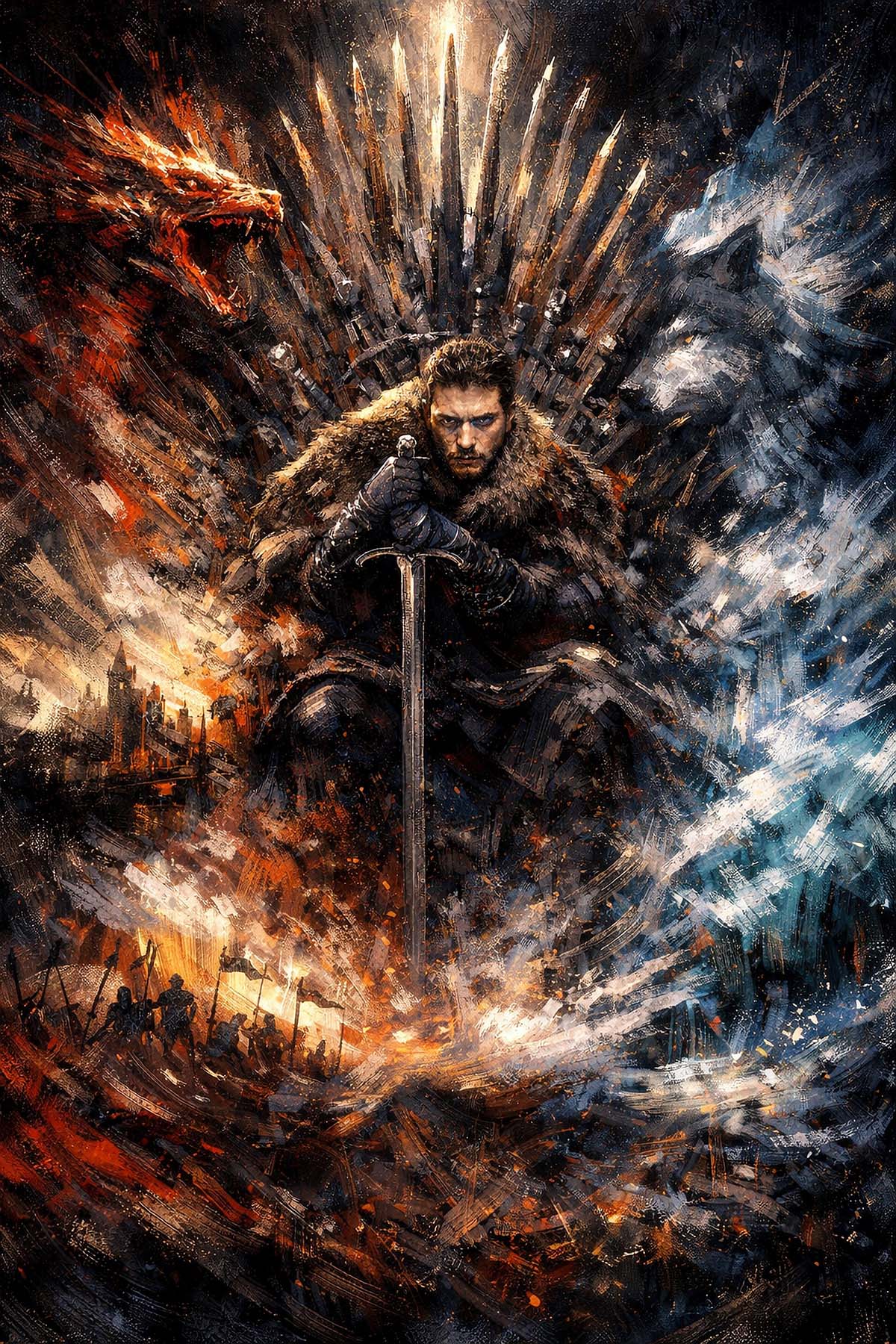 A storm of fire and frost surrounds Jon Snow as he claims his place before the Iron Throne. The shattered battlefield, clashing armies, and the looming presence of dragons evoke the brutal struggle that defined the fate of Westeros. Flames blaze on one side while icy winds surge on the other, capturing the eternal tension between fire and ice. At the center stands the reluctant warrior, sword grounded and gaze unyielding, embodying honor, sacrifice, and destiny. The throne of swords rises behind him like a crown of conquest, transforming this moment into a powerful tribute to the legendary leader who carried the weight of kingdoms on his shoulders.