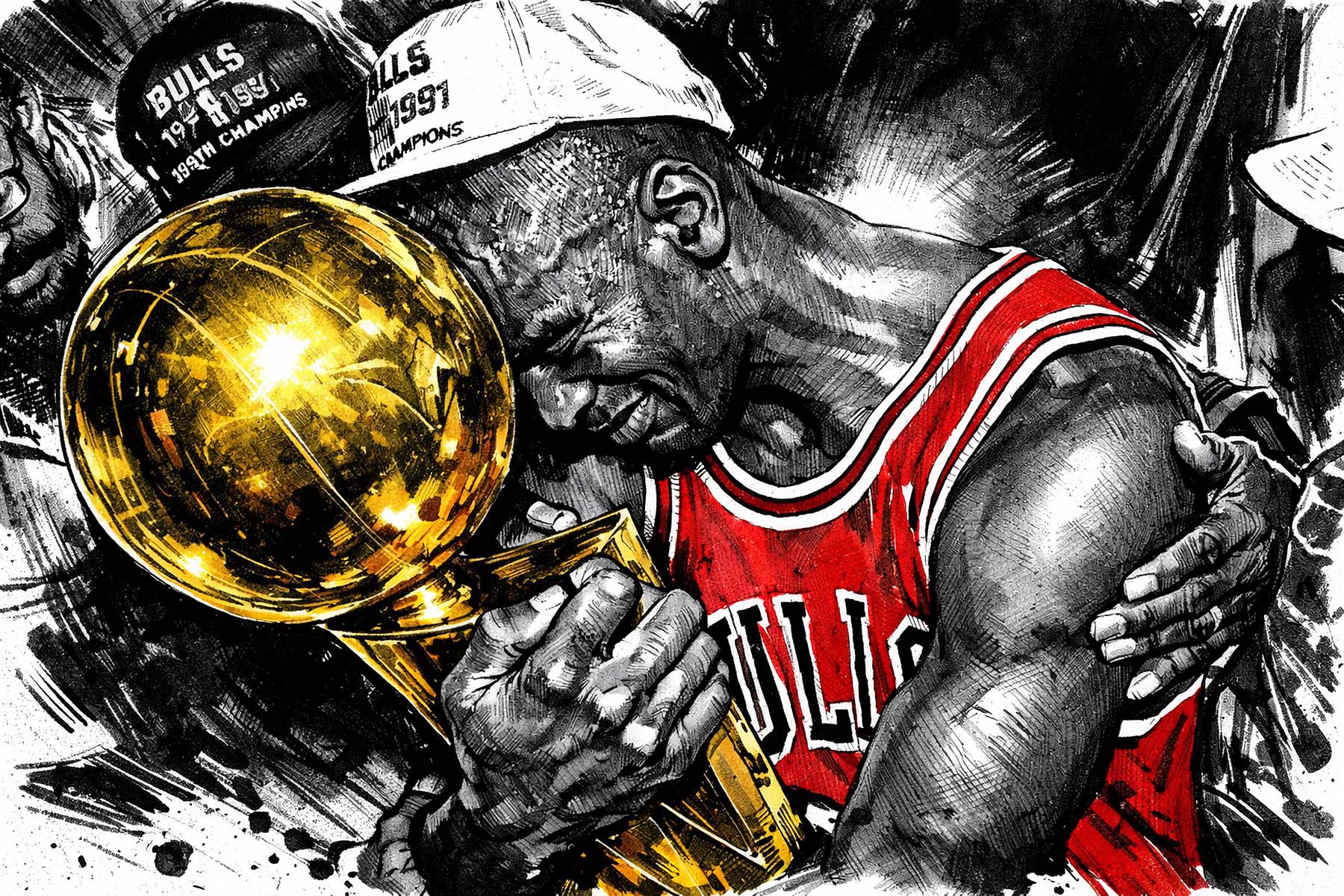 Michael Jordan holds the golden championship trophy in a moment that defines basketball greatness. Wearing the iconic Chicago Bulls red, he embraces the symbol of a dynasty built on relentless drive, unmatched skill, and legendary leadership. The striking contrast of bold red and gleaming gold highlights the triumph of a player who transformed the game and delivered multiple titles to Chicago. Every detail captures the emotion, pride, and dominance of the Bulls’ championship era. Powerful and timeless, the scene celebrates the legacy of the athlete whose competitive fire and clutch performances made him one of the most revered figures in sports history.