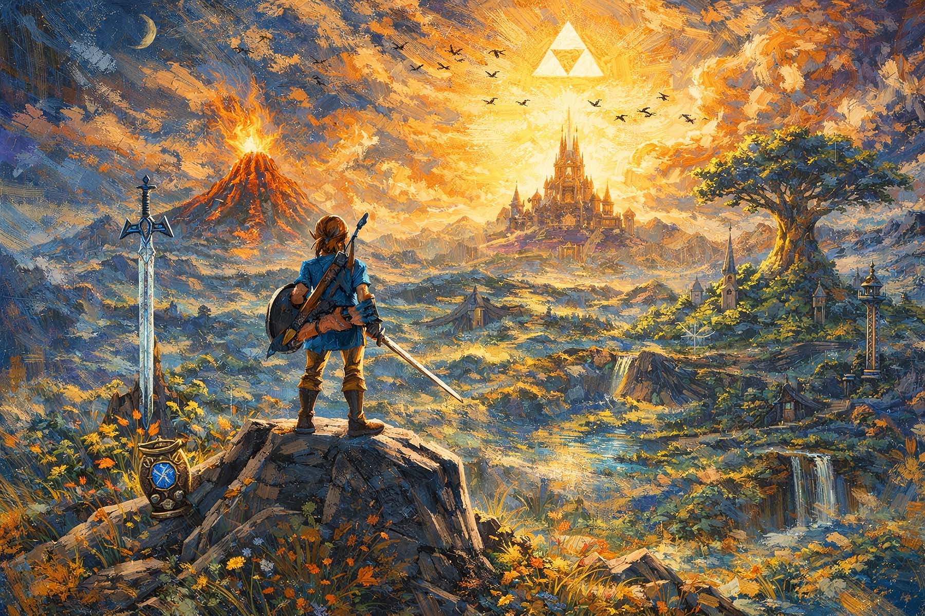 A breathtaking tribute to The Legend of Zelda, this epic fantasy landscape captures the heroic spirit of Link as he gazes across the vast kingdom of Hyrule. Standing atop a cliff with sword and shield in hand, the legendary hero looks toward a glowing castle beneath the radiant Triforce symbol in the sky. Rolling valleys, ancient ruins, waterfalls, and distant mountains create a magical world filled with adventure and destiny. The fiery volcano and golden sky add a dramatic sense of scale, symbolizing the trials that await on the hero’s journey. This vibrant composition celebrates courage, exploration, and the timeless quest that has defined one of gaming’s most beloved fantasy worlds.