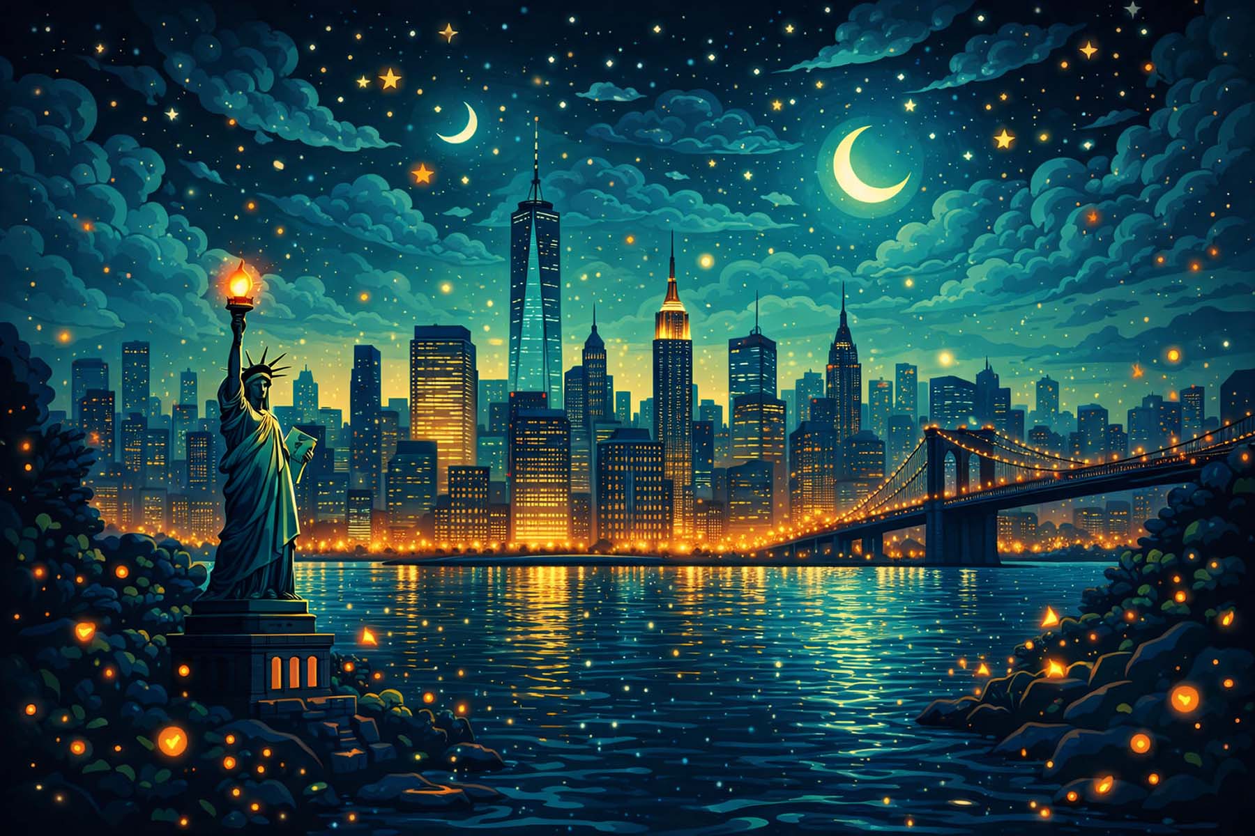 Experience the magic of New York City at night in this stunning skyline scene illuminated beneath a sky filled with stars and crescent moons. The Statue of Liberty stands proudly in the foreground holding her torch high as the glowing Manhattan skyline rises beyond the water. Reflections shimmer across the river while the Brooklyn Bridge stretches across the city lights, connecting the iconic landmarks that define New York. Warm golden tones contrast with deep blue night skies, creating a peaceful yet vibrant atmosphere. This artwork captures the timeless beauty, energy, and romance of the city that never sleeps under a breathtaking starlit sky.