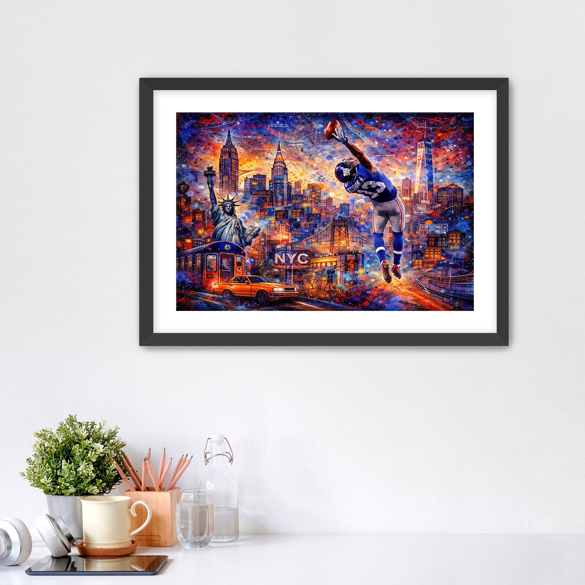 This dynamic, high-energy artwork captures a legendary New York football moment suspended above the city that defines the game’s biggest stages. Giants wide receiver Odell Beckham Jr soars through the air for a one-handed catch, frozen in a split second of athletic brilliance, while the NYC skyline explodes around him in vibrant color and motion. Iconic city landmarks, glowing streets, and abstract splashes of paint fuse together to reflect the intensity, confidence, and drama of New York football.